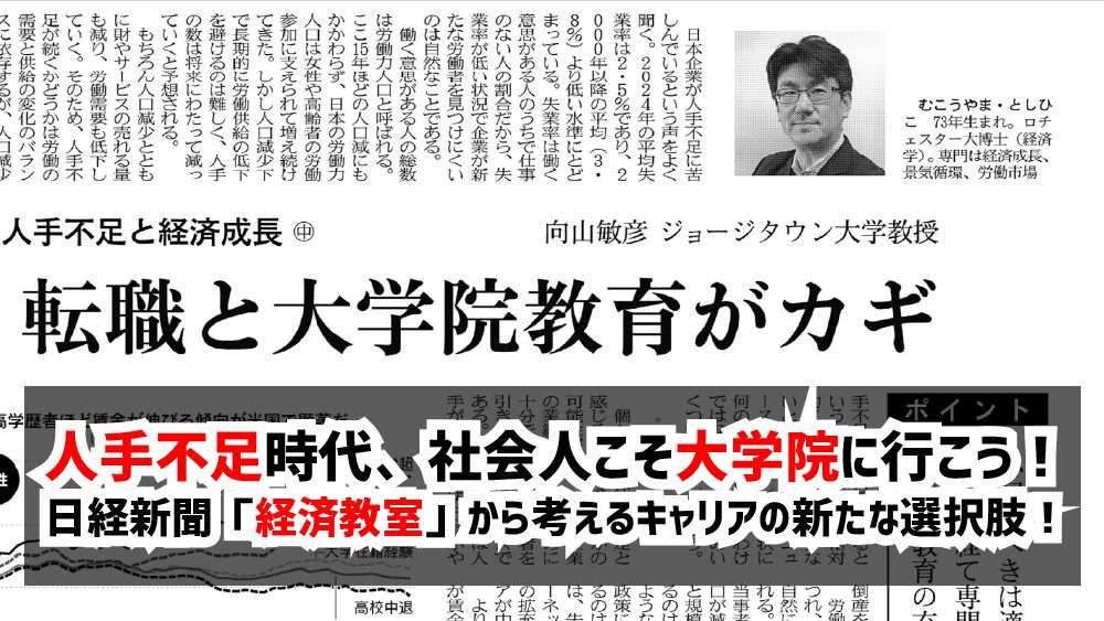 7/30付の日経新聞「経済教室」には向山敏彦先生の記事が掲載されています。そこでは日本企業における採用ミスマッチを減らすため転職市場と大学院教育の活性化が提唱されていました。企業の人材育成機能が弱まる中、社会人が大学院で専門性を磨くことが重要です。それがあなたのチャンスを広げるのに直結しますよ!