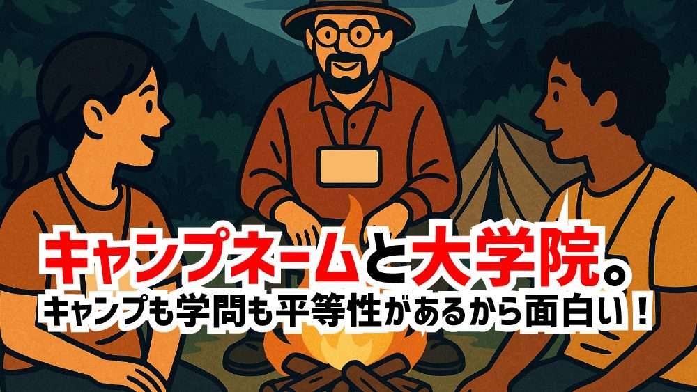 キャンプには普段の肩書きや立場をリセットし、平等な関係で関われる魅力があります。その象徴が「キャンプネーム」。特別な名前で呼び合うことで上下関係を超えたつながりが生まれます。大学院のディスカッションも同様で、立場を超えて真理を探求する平等性が重視されます。ぜひ大学院で学問の世界における非日常性を楽しんでみて下さい!