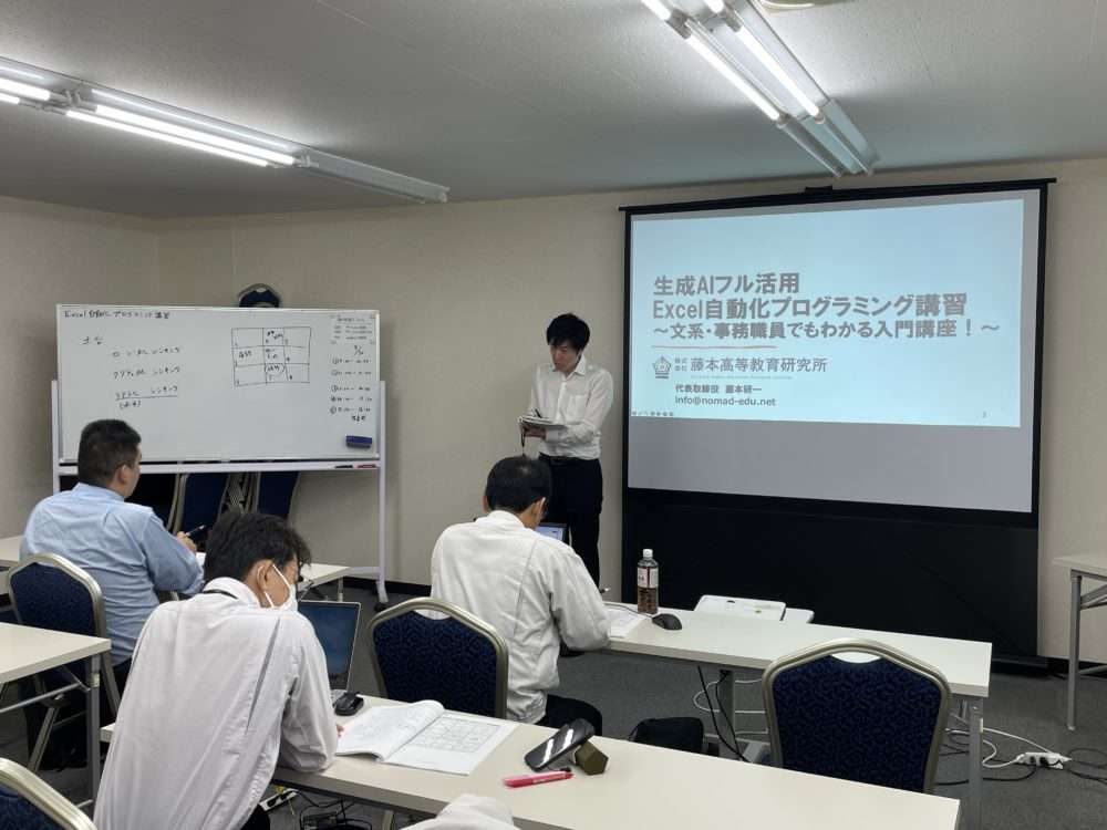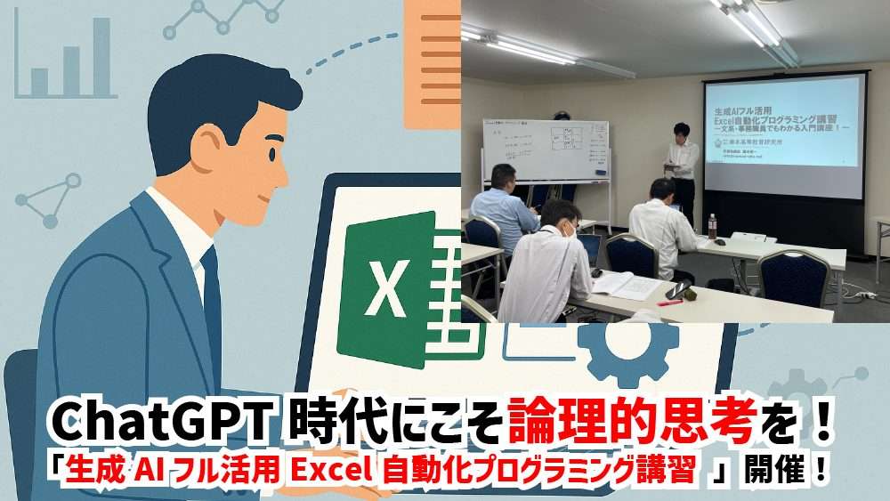 2025年9月29日・30日に「生成AIフル活用Excel自動化プログラミング講習」を開催しました。ChatGPTを正しく活用するには人間の論理的思考力が欠かせません。人間側が明確な指示でこそ期待通りの結果が得られます。実際にマクロを作成し、業務改善に直結するAI活用の第一歩を体感していただく研修となりました!