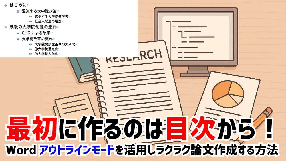今回は論文作成の際「アウトラインモードを使って論文の目次を作る」大事さをお伝えします!