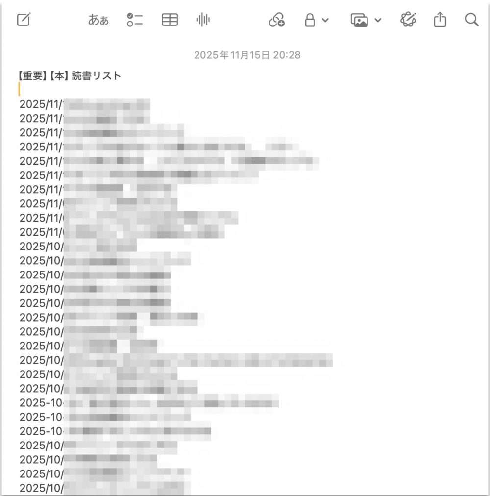 1つのメモ欄に、日付と読んだ本のタイトルを打ち込んでいくという形です。