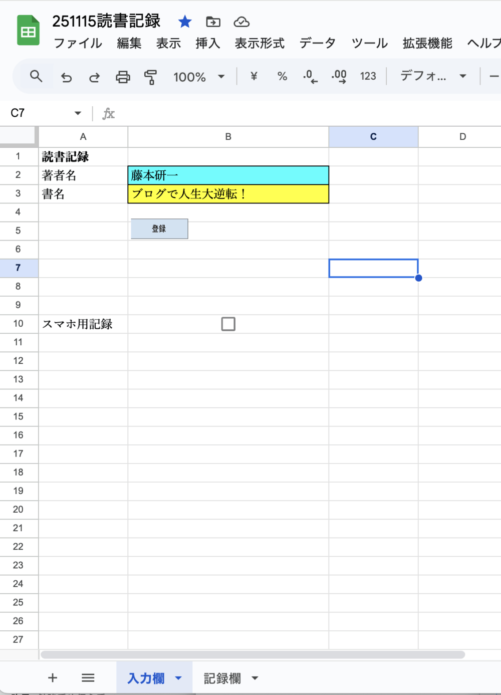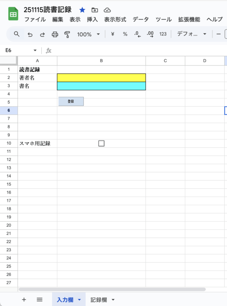 シート1(記録欄)に著者名に名前、書名欄に本のタイトルを打ち込みます。