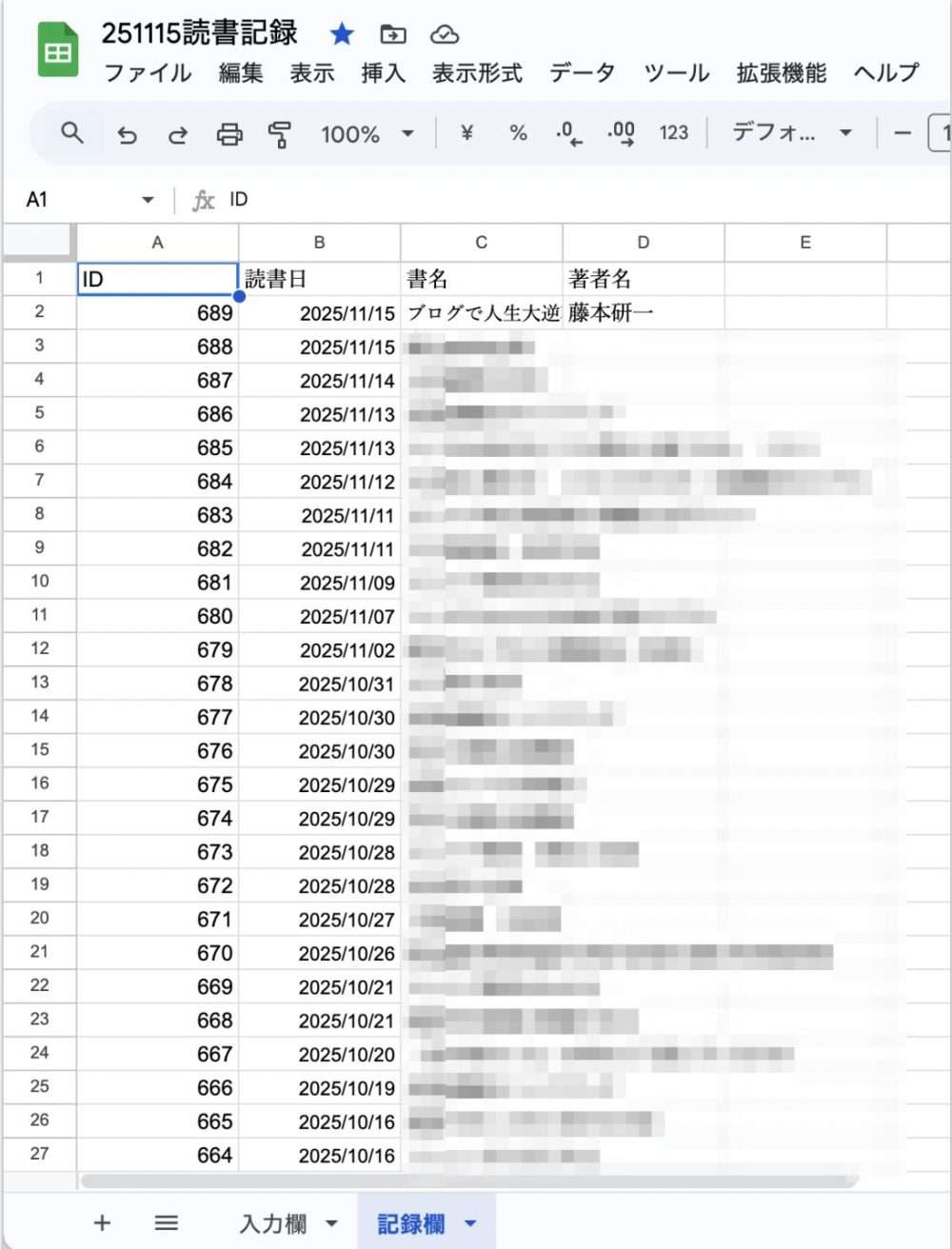 これで完成でも良かったのですが、この場合今後は毎回行を2行目に挿入した上、ID番号を追加して日付と本のタイトルを打ち込む必要が出てきます。