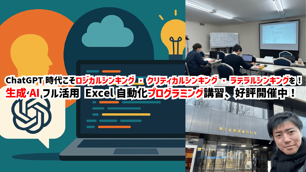 さて私は先日11月20日〜21日の2日間、札幌駅前ビジネススペース(北海道第二道通ビル)にて「生成AIフル活用 Excelマクロ自動化プログラミング講習」に講師として登壇しました。