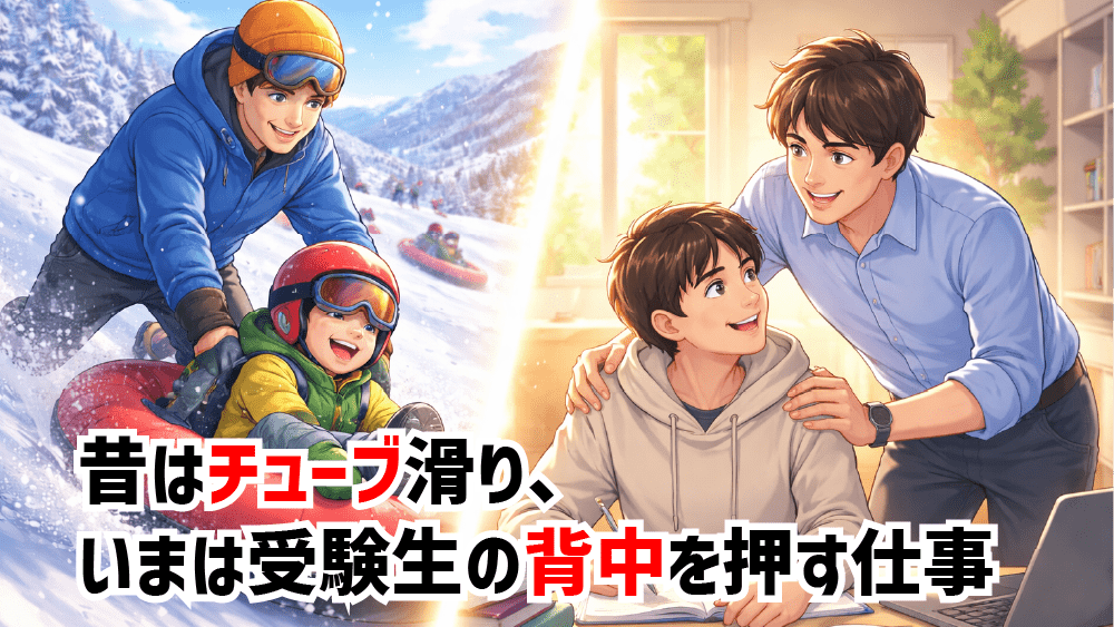 昔、冬の滝野すずらん丘陵公園でチューブ滑りの仕事をしていました。人の背中を物理的に押して安全に送り出す仕事。いまは大学院受験や進路に悩む受験生の背中を、言葉と伴走で押しています。立場や方法は変わっても、「一歩踏み出す瞬間を支える」という本質は変わらないと感じています。