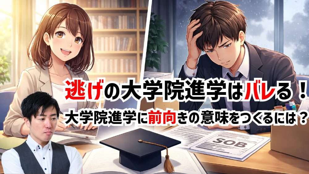 「まだ社会に出たくない…」「職場がイヤだから休職して進学する…」。大学院進学の志望理由って「前向き」なものだけでなく「逃げ」の動機もあります。就活や職場から離れたい気持ち自体は悪くありません。大切なのは「逃げ」の動機に「大学院で何を学び、どう活かすか」という前向きな理由を後付でいいから作ることです!