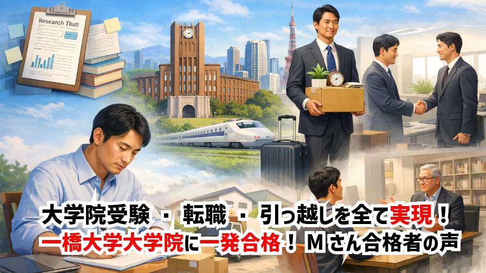 「行きたい大学院が近くにない…」という理由で進学を諦めていませんか?社会人のMさんは「一橋大学大学院で学びたい」という思いから受験に挑戦。1対1大学院合格塾を経て見事合格なさったあとは転職を実現、今年4月からは東京に引っ越しての新生活をスタートなさいます。そんなMさんの合格者の声をご紹介します!