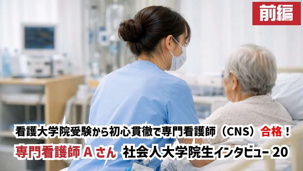 社会人大学院生へのインタビュー企画第20弾!今回は専門看護師Aさんへのインタビューの前編です。Aさんは専門看護師(CNS)を目指して大学院に進学し、仕事を続けながら3年間で修士課程を修了。修了後のCNS試験にも合格し、現在も臨床で活躍中です。大学院では研究中心の学びに戸惑いながらも、計画力や段取り力が身についたと語っていただきました!