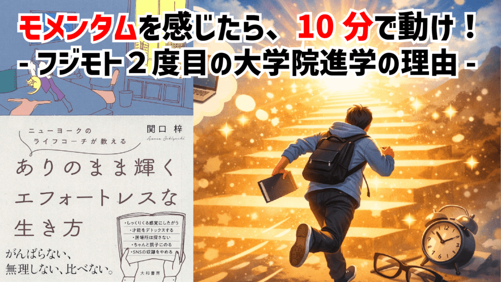 「これやってみたい!」と心に浮かぶ瞬間(モメンタム)は、人生を変えるきっかけになります。ですが多くの場合言い訳して行動せず終わってしまいます。大切なのは、その瞬間に10分以内でいいので小さく行動すること。実際に私もこうやって大学院合格を掴みました!ひらめきを大事にし、すぐ動くことが未来を変えますよ!